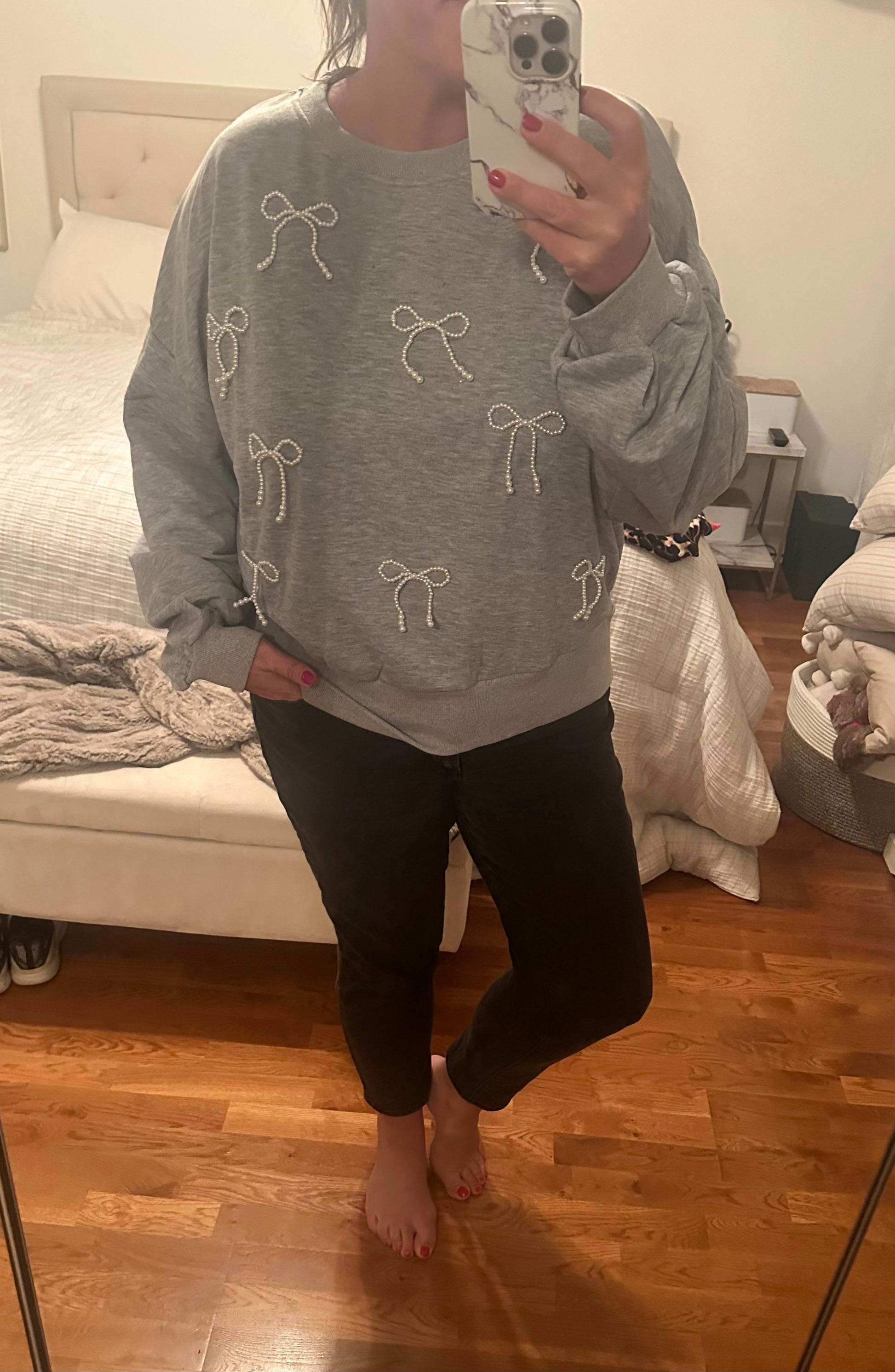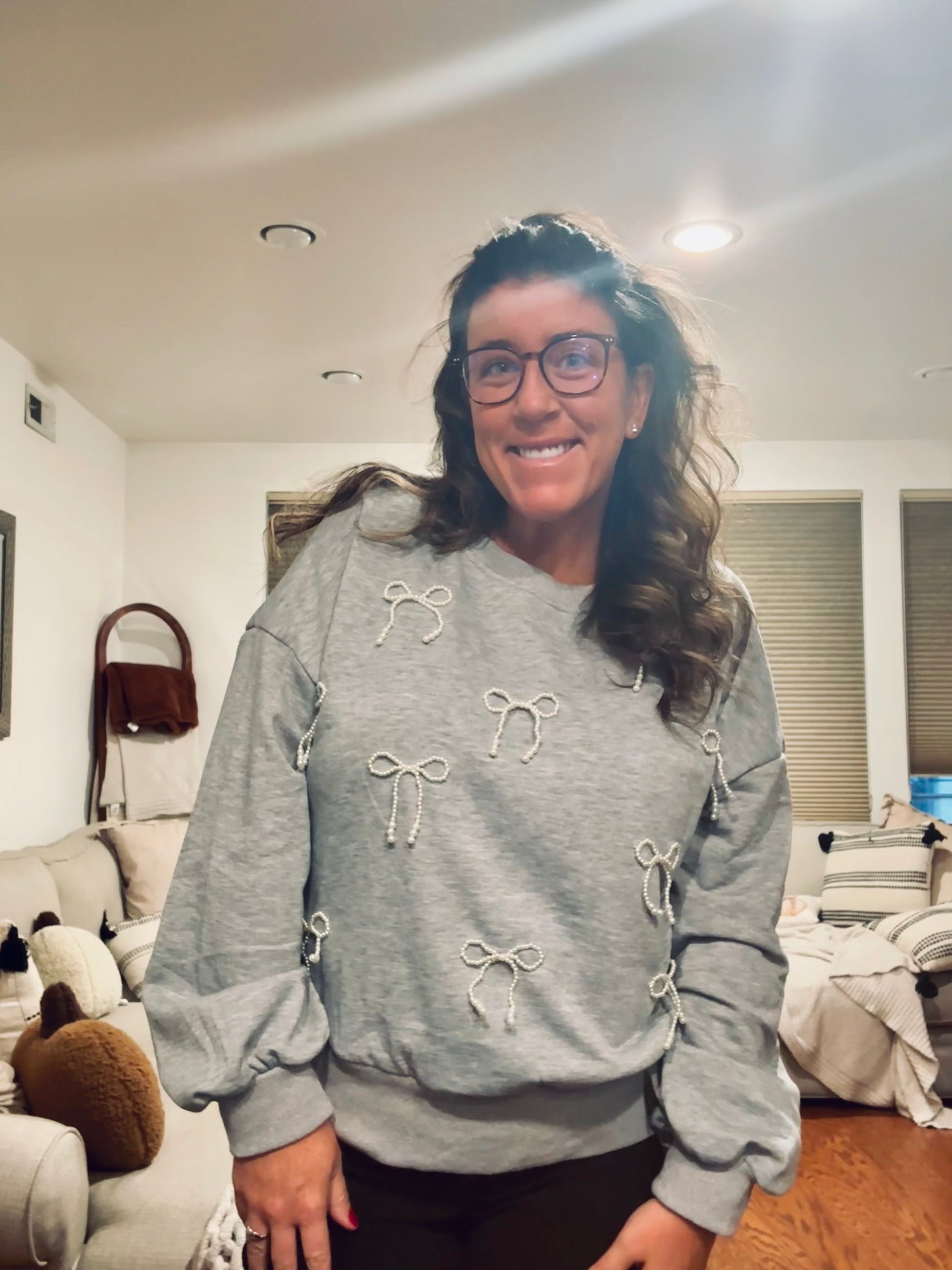 Elevate your cozy-day style with the Pearl Kissed Bow Pullover. This soft and relaxed sweatshirt adds a feminine twist with delicate pearl-embellished bows scattered across the front, giving it the perfect mix of casual comfort and chic detail. Designed with a slightly stretchy fit for ease of movement, it’s an effortless choice for pairing with jeans, leggings, or even a cute skirt. Whether lounging at home or stepping out for a casual day, this pullover is your go-to for cozy elegance.