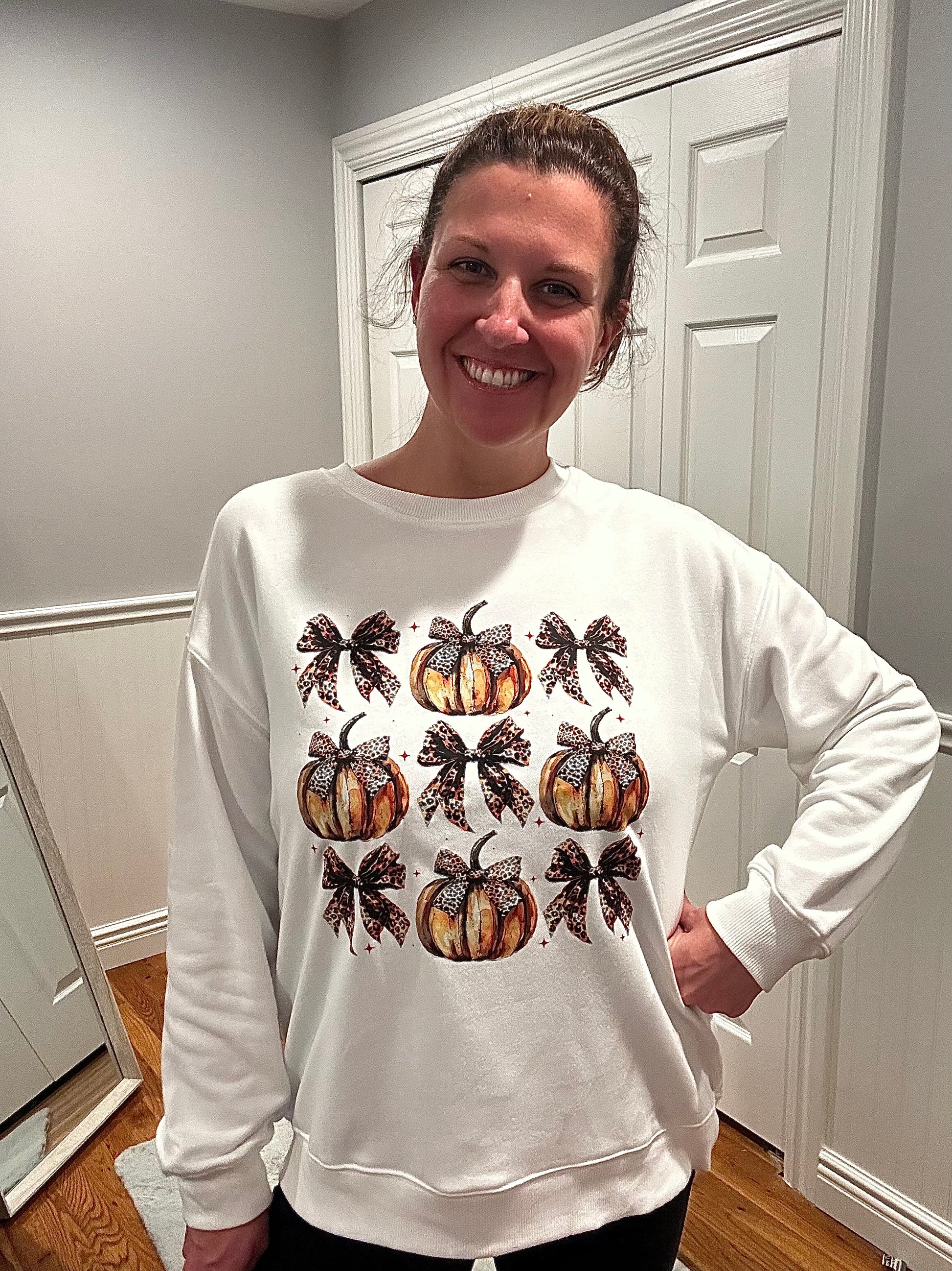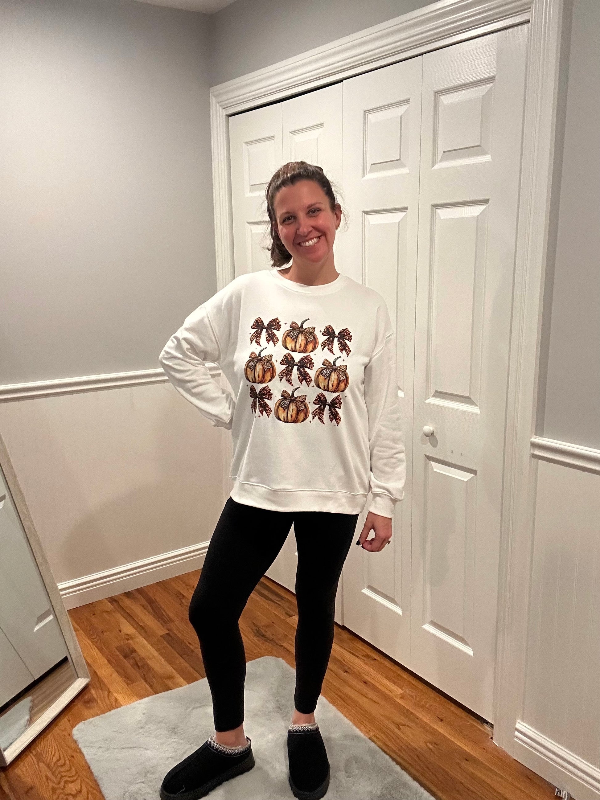 Bring a touch of seasonal charm to your everyday style with the Sweet Harvest Crew. Featuring a playful pumpkin-and-bow graphic, this long sleeve sweatshirt is the perfect mix of cozy comfort and festive flair. Its basic style and opaque finish make it an easy go-to for pairing with jeans, leggings, or joggers during crisp autumn days.