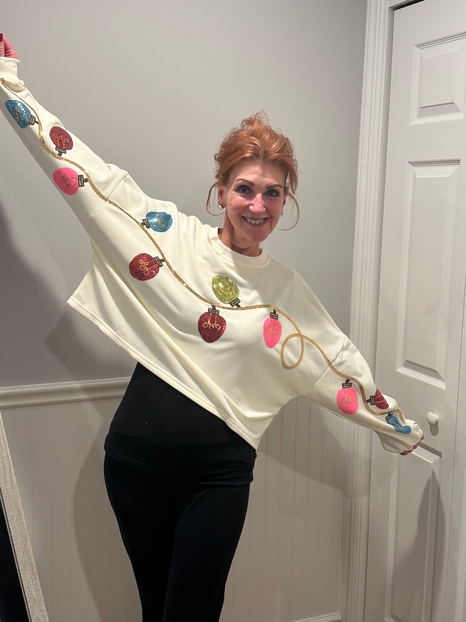 Whether you’re trimming the tree, hosting your holiday party, or just sipping cocoa by the fire, this sweatshirt keeps you glowing all season long.